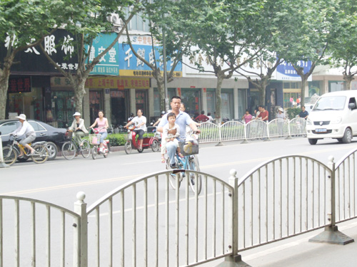 看這位父親,單手騎車(chē)橫穿馬路,另一只手還抱著孩子。(攝影:菩薩保佑)