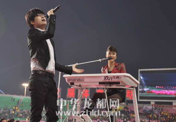 就在觀眾意猶未盡之時(shí),著名演唱組合“玖月奇跡”突然出現(xiàn)在表演場(chǎng)地上,引起觀眾一陣騷動(dòng)?!熬猎缕孥E”的女成員王小瑋在專用樂器“雙排鍵”上手腳并用,演奏出優(yōu)美樂曲的同時(shí),男歌手王小海飆起了高音,震驚全場(chǎng),把現(xiàn)場(chǎng)氣氛又一次推向高潮。