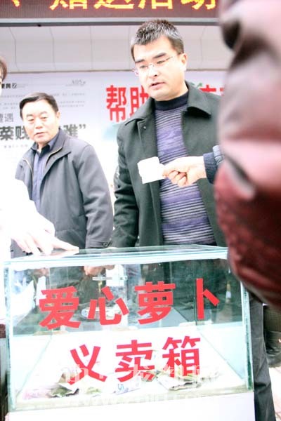 ????經(jīng)過(guò)商量,本報(bào)決定聯(lián)合同和堂大藥店開(kāi)展“愛(ài)心蘿卜”義賣(mài)、贈(zèng)送活動(dòng)。在川匯區(qū)七一中路與工農(nóng)路交叉口處的同和堂大藥店門(mén)前設(shè)立愛(ài)心捐款箱,市民只要獻(xiàn)出自己的一份愛(ài)心,“愛(ài)心蘿卜”隨便拿;設(shè)立愛(ài)心蘿卜購(gòu)買(mǎi)聯(lián)絡(luò)點(diǎn),如社會(huì)團(tuán)體、個(gè)人需要購(gòu)買(mǎi)蘿卜,只需將“愛(ài)心蘿卜款”投進(jìn)愛(ài)心捐款箱,所有愛(ài)心捐款歸農(nóng)民;憑購(gòu)藥小票,市民就可領(lǐng)取一份“愛(ài)心蘿卜”。