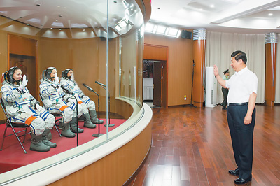 6月11日,中共中央總書記、國(guó)家主席、中央軍委主席習(xí)近平在酒泉衛(wèi)星發(fā)射中心觀看神舟十號(hào)載人飛船發(fā)射。這是習(xí)近平向即將出征的航天員聶海勝、張曉光、王亞平揮手致意。 新華社記者 李學(xué)仁攝 |