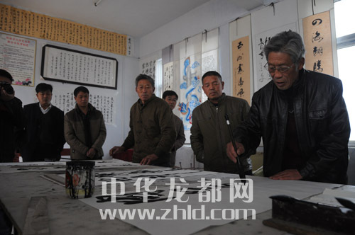 ????作為距離太康縣城最遠(yuǎn)的一個(gè)邊界鄉(xiāng)鎮(zhèn),轉(zhuǎn)樓鄉(xiāng)的文化活動(dòng)開展得有聲有色。該鄉(xiāng)依托文化站,成立了在鄉(xiāng)一級(jí)少見(jiàn)的文聯(lián),下設(shè)書法家協(xié)會(huì)、腰鼓協(xié)會(huì)、嗩吶協(xié)會(huì)等。我們?cè)谵D(zhuǎn)樓鄉(xiāng)政府采訪時(shí),正碰上書法家協(xié)會(huì)20多名會(huì)員在一起切磋書藝。今年74歲的許家榮是鄉(xiāng)書法家協(xié)會(huì)主席,也是《周口晚報(bào)》的老讀者,看到我們到來(lái),老人興之所至,當(dāng)場(chǎng)揮毫潑墨,為本報(bào)題寫了“周口邊界行接地氣有人氣”的條幅。據(jù)了解,每逢春節(jié),書法家協(xié)會(huì)會(huì)員都會(huì)走村串戶,為村民義務(wù)書寫春聯(lián)。