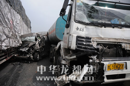 ????現(xiàn)場,20多輛汽車駕駛室嚴(yán)重變形。一輛懸掛晉M牌照拉木材的貨車的駕駛室被撞成一團(tuán),方向盤甩在4米外的路面上。約2公里長的地面上散落了不少貨物、車窗碎片及大片機(jī)油。