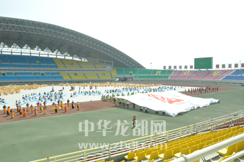 參加我市第三屆運(yùn)動會開幕式的演職人員在體育場彩排