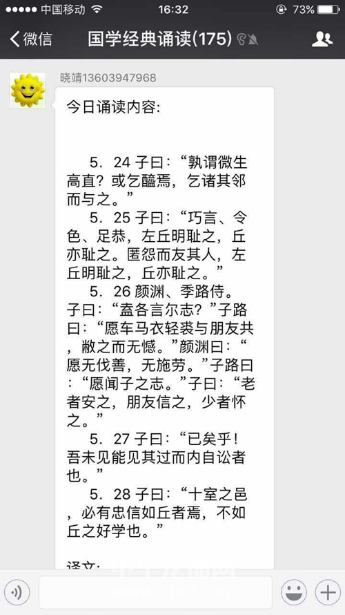????建立該微信群的是團(tuán)市委工作人員劉曉靖。劉曉靖告訴周口晚報(bào)記者,建立該微信群的目的是想讓大家多讀讀國(guó)學(xué)經(jīng)典,增加大家的文學(xué)涵養(yǎng),讓大家養(yǎng)成讀書(shū)的習(xí)慣。“剛開(kāi)始只有十幾個(gè)人,大家有些不好意思,有的人覺(jué)得自己讀得不好張不開(kāi)口,我就做一些示范,引領(lǐng)大家誦讀。不久,加入微信群的人多了,通過(guò)幾個(gè)人帶動(dòng),大家誦讀的就多了。”劉曉靖說(shuō),讀的方式就是大家通過(guò)微信的語(yǔ)音功能,讀一些《論語(yǔ)》中的經(jīng)典句子。過(guò)了一段時(shí)間,大家對(duì)這種方式越來(lái)越認(rèn)可,加入該微信群的人也越來(lái)越多,人數(shù)從剛開(kāi)始的十幾個(gè)人增加到近200人?,F(xiàn)在,該微信群里不但有電臺(tái)、電視臺(tái)的專(zhuān)業(yè)主持人,而且有一些學(xué)者。以前拿不準(zhǔn)的字,現(xiàn)在都會(huì)有人講解,大家也有了學(xué)習(xí)對(duì)象。這個(gè)微信群從成立到現(xiàn)在,《弟子規(guī)》、《大學(xué)》、《中庸》、《論語(yǔ)》已讀一遍,四書(shū)里面只剩下《孟子》還沒(méi)有讀。
