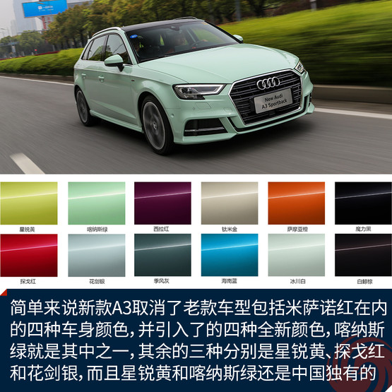 先來說說喀納斯綠到底是什么顏色吧。簡單來說新款A3取消了老款車型包括米薩諾紅在內的四種車身顏色,并引入了的四種全新顏色,喀納斯綠就是其中之一,其余的三種分別是星銳黃、探戈紅和花劍銀,而且星銳黃和喀納斯綠還是兩種中國市場獨有的顏色。如果說這個顏色看上去像什么,我覺得大概像是哈密瓜冰激凌,或者是綠色的奶油,反正給我一種清新又甜蜜的錯覺。