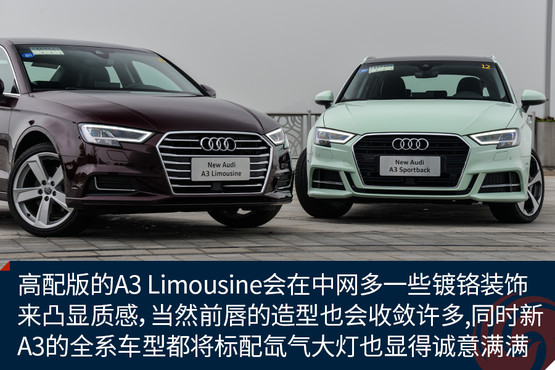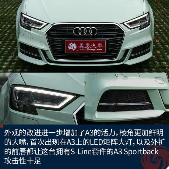 新顏色的加入讓原本青春靚麗的A3變得更加鮮嫩,雖說這樣的顏色不一定適合所有人,但是至少我是很喜歡的,應該不少女生也會心生好感。而外觀的改進進一步增加了A3的活力,棱角更加鮮明的大嘴,首次出現(xiàn)在A3上的LED矩陣大燈,以及外擴的前唇都讓這臺擁有S-Line套件的A3 Sportback攻擊性十足,同時全系都將標配氙氣大燈也是誠意滿滿。而高配置的A3 Limousine會在中網(wǎng)多一些鍍鉻裝飾來凸顯質感,當然前唇的造型也會收斂許多。