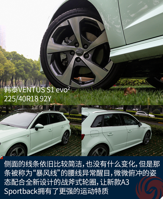 側面的線條依舊比較簡潔,也沒有什么變化,但是那條被稱為“暴風線”的腰線異常醒目,微微俯沖的姿態(tài)配合全新設計的戰(zhàn)斧式輪圈,讓新款A3 Sportback擁有了更強的運動特質。
