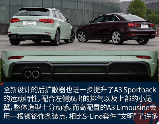 全新設計的后擴散器也進一步提升了A3 Sportback的運動特性,配合左側雙出的排氣以及上部的小尾翼,整體造型十分動感。而高配置的A3 Limousine會用一根鍍鉻飾條裝點,相比S-Line套件“文明”了許多。與LED矩陣大燈相呼應的是全LED尾燈,兩者相輔相成為新車帶來了更強的攻擊性以及橫向視覺延展性,新加入的流動式轉向燈在美觀的同時也提升了整車的科技感。