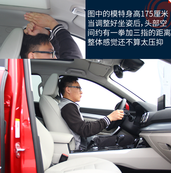 體驗(yàn)者身高175厘米,前排座椅降到最低的時(shí)候頭部還有比較充足的余量,完全不會(huì)感覺(jué)到壓抑;不過(guò)后排頭部就不太行了,頭部距離車頂非常接近,要是身高再高一些的乘客坐進(jìn)后排,已經(jīng)基本上快頂?shù)筋^了。儲(chǔ)物空間中規(guī)中矩,基本上沒(méi)有太多讓人驚喜的地方。扶手箱的空間不小,高度也合適,可以放些雜物。