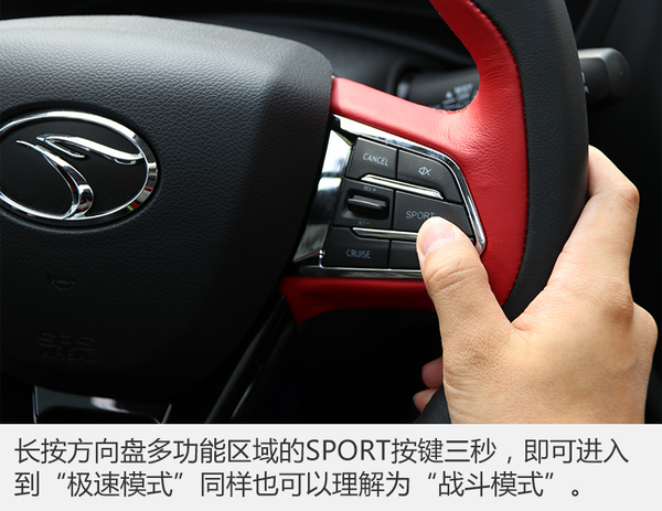 此次DX3 SRG在原有的運(yùn)動(dòng)模式外,還新增了“極速競(jìng)技模式”同時(shí)開啟方法也很簡(jiǎn)單,只需要長(zhǎng)摁方向盤右側(cè)的SPORT按鍵三秒,這時(shí)儀表板會(huì)由白色背光變成紅色,表示已經(jīng)進(jìn)入該模式。