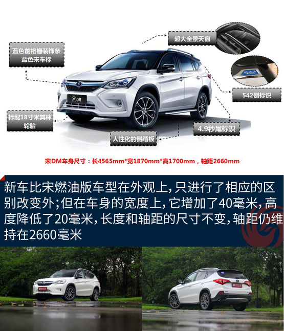 ????????外觀方面,宋DM與燃油版車型基本保持一致,其延續(xù)了X形的前臉造型設計,整個前臉時尚、運動。而在一些細節(jié)上,它與唐100一樣,都有新能源車型專屬的特征,車身D柱處還標有比亞迪“542”標識,并在車尾部標有“4.9s”標識,強調了該車型的動力系統(tǒng)較為強大。車身尺寸方面,宋DM車型的長寬高分別為4565×1870×1700毫米,軸距為2660毫米。