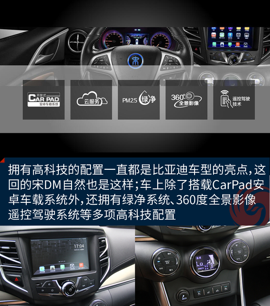 ????????內飾方面,宋DM保持了家族式設計,具有較強立體感,并采用了大量的軟性材料包裹。配置方面,新車將配備有全景天窗、360度全景影像、遙控駕駛、三輻式多功能平底方向盤以及電子手剎等配置。宋DM除了配備ESP車身電子穩(wěn)定系統(tǒng),TCS牽引力控制系統(tǒng)、胎壓監(jiān)測等電子科技配置,還搭載CarPad多媒體系統(tǒng)、PM2.5綠凈系統(tǒng)等豪華配置。