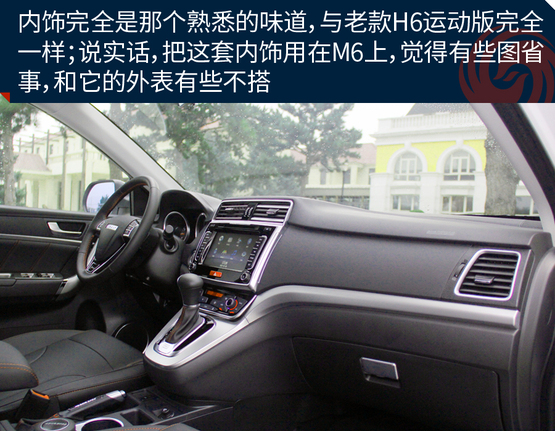 ????????M6的空間表現(xiàn)在同級(jí)別車型當(dāng)中屬于優(yōu)勢地位,主要原因就是內(nèi)部空間和H6基本沒區(qū)別。特別得說新車的座椅,很柔軟、舒服,包裹性也不錯(cuò)。不過坐姿真的有點(diǎn)高,前排座椅調(diào)到最低后還是能看到整個(gè)機(jī)艙蓋,這樣倒是為了安全性;后排的座椅還要更高一些,有點(diǎn)類似劇院式的設(shè)計(jì),給后排乘客減少了壓抑感。