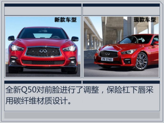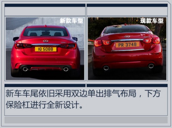 全新英菲尼迪Q50對外觀進行了調整,前臉采用上下分體式格柵設計,上格柵為網狀造型,保險杠下唇為碳纖維材質。車尾取消了車牌下方鍍鉻飾條以及兩側反光板,下方保險杠換裝黑紅雙色護板。