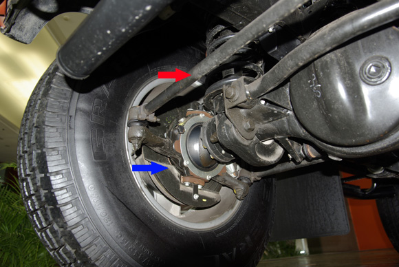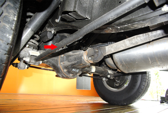 ????衛(wèi)士的后軸采用拖臂式后懸,紅色箭頭所指的拉桿就是拖臂。左右各一根,拖臂及避震機(jī)對后軸的自由度進(jìn)行控制,后軸相對車架的位置和自身的扭轉(zhuǎn)都得到了控制。