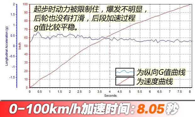 ????雖然可以關閉穩(wěn)定系統(tǒng),但感覺卻對發(fā)動機輸出非常保守,變速箱也不允許拉到很高的轉(zhuǎn)速。起步后車輪沒有明顯滑動,說明并沒有達到最佳輸出狀態(tài),最終成績?yōu)?.05秒,成績與老款車型有差距,略有遺憾。
