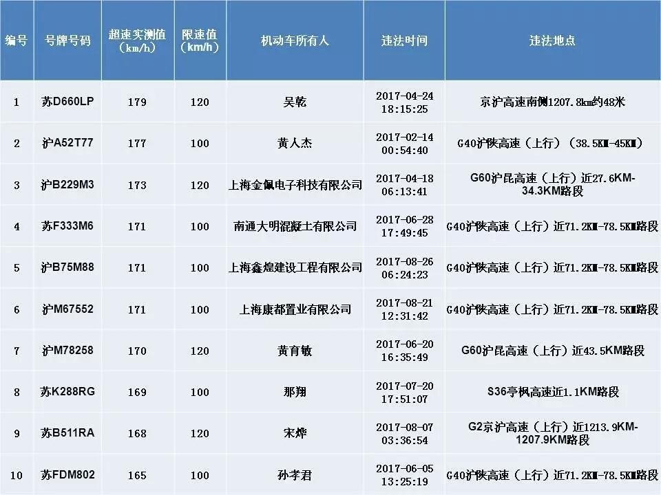 ????中青在線上海9月12日電(中國(guó)青年報(bào) 中青在線記者 王燁捷)上海交警今天公布今年以來“前五十”機(jī)動(dòng)車超速違法名單,最高時(shí)速竟達(dá)179km/h。
