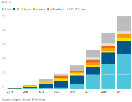 經(jīng)證實(shí),至2017年11月底,全球電動(dòng)汽車保有量已超過300萬輛。2017年前11個(gè)月電動(dòng)汽車銷量超過100萬。