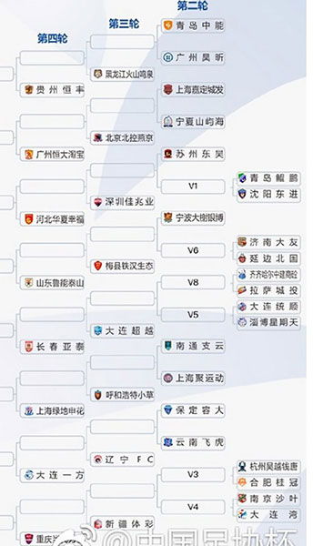 第四輪開(kāi)始16支中超球隊(duì)加入角逐,加上從第三輪晉級(jí)的16支球隊(duì),共32支球隊(duì)參賽,中超球隊(duì)自動(dòng)落位相應(yīng)客場(chǎng)簽位,其中廣州恒大、上海申花、上海上港和天津權(quán)健4支亞冠球隊(duì)將分別落位在A、B、C、D區(qū),這4支球隊(duì)在半決賽之前不會(huì)相遇。