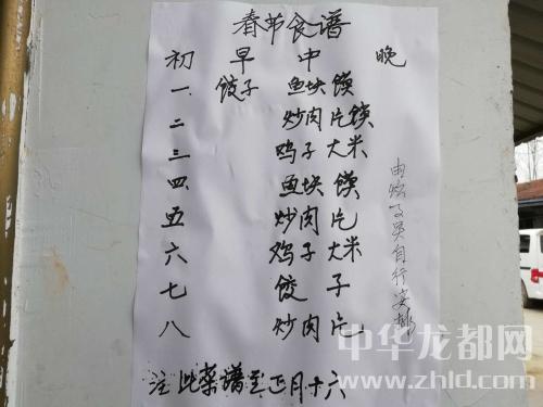 午飯時,老人們井然有序地端著饅頭、大米粥、小酥肉等在餐廳內(nèi)就餐。兩個剛吃過飯的老人仔細(xì)查看貼在食堂門口的《春節(jié)食譜》,路過的一位老太太開玩笑說他們吃著碗里看著鍋里。李學(xué)告訴記者:“從正月初一到正月十五,敬老院的菜譜葷素搭配,每日三餐不重樣。5名炊事員一門心思想讓老人吃得香、吃得鮮、吃得好?!蓖瑫r,記者發(fā)現(xiàn)在敬老院的前排房間前,兩名服務(wù)員正推著餐車一間挨著一間為行動不便的老人們送水、送飯。