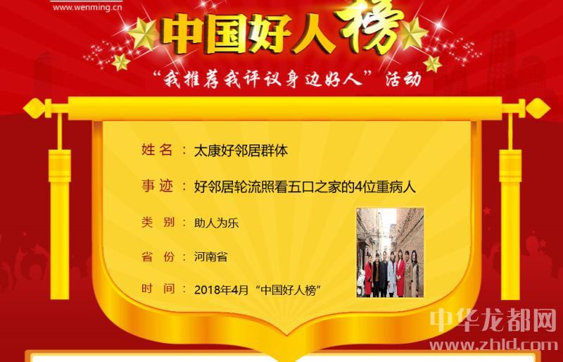中華龍都網訊(周口報業(yè)全媒體記者 馬治衛(wèi))4月28日上午,4月中國好人榜發(fā)布儀式暨全國道德模范與身邊好人現場交流活動在天津市和平區(qū)舉行。太康縣“好鄰居群體”榮登4月份中國好人榜。