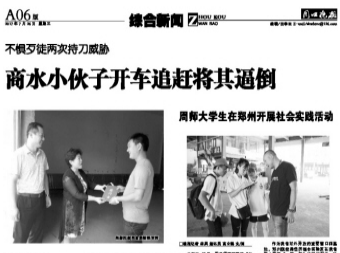 對(duì)于周口晚報(bào)的讀者朋友來說,熱心小伙陳亞輝并不算陌生——去年7月,陳亞輝曾駕駛自己的車輛逼停一位飛車搶奪項(xiàng)鏈的歹徒(2017年7月26日周口晚報(bào)圖文并茂報(bào)道),商水縣民政局局長朱赫受縣領(lǐng)導(dǎo)委托,到譚莊鎮(zhèn)慰問并看望陳亞輝,后來陳亞輝被商水縣委、縣政府評(píng)為“見義勇為道德模范”。
