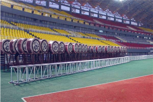 圖①:跑道邊上音響整齊排列。