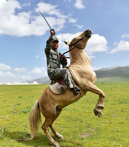 盛夏的巴塘草原,天藍草綠,戰(zhàn)馬嘶鳴。不遠處的開闊地上,豎著7個高低不同的靶標。隨著連長王育龍一聲令下,駕著“頭馬”的上士趙雪超高聲長嘯揚鞭策馬疾馳,他利落地拔出馬刀,左刺右劈,刀起靶落,一整套動作一氣呵成,彪悍十足。近距離觀摩課目示范的騎兵連新兵一個個驚呼“開了眼”,都說從趙班長身上看到了影視劇里蒙古鐵騎的影子。