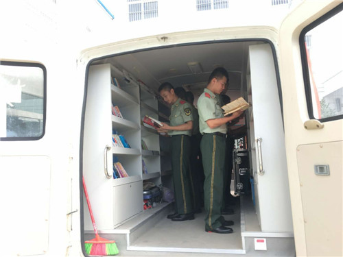 文化擁軍是商水縣圖書館的優(yōu)良傳統(tǒng)。當(dāng)天,流動圖書車一來到縣武警中隊駐地,士兵們便不約而同圍了過來,有的走上圖書車尋找喜愛的圖書,有的則直接坐在車上,認(rèn)真翻閱書籍。戰(zhàn)士小劉表示:“我最喜歡人物傳記方面的圖書,今天他們送來了許多。我要充分利用這些圖書,讀好書、立好志、當(dāng)好兵,為實現(xiàn)中國夢、強軍夢和祖國的國防建設(shè)作出應(yīng)有貢獻。”