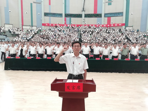 “不忘初心、牢記使命………爭分奪秒、苦干實(shí)干,堅(jiān)決打贏脫貧攻堅(jiān)戰(zhàn)!”隨著縣委書記馬明超領(lǐng)誓,與會(huì)的約4000名干部集體莊嚴(yán)宣誓??h委副書記、縣長王毅主持大會(huì)。