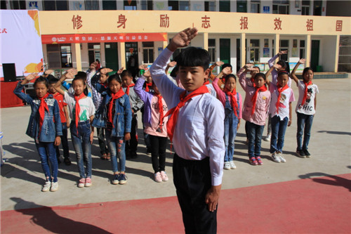 神圣而又雄壯的國(guó)歌響起了。孩子們瞪大了眼睛,小擎旗手猛地甩出臂膀,將耀眼的五星紅旗撒在陽(yáng)光下,全體孩子們行少先隊(duì)隊(duì)禮,注視著國(guó)旗冉冉升起。孩子們的歌聲越來(lái)越嘹亮,直到最后還在高喊:“前進(jìn),前進(jìn)進(jìn)……”