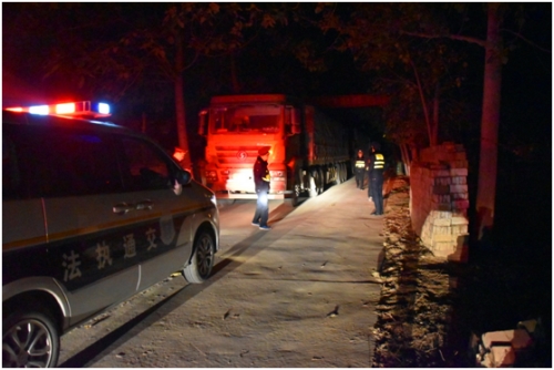 當日22時40分,該所副所長楊春風同志帶領(lǐng)兩個執(zhí)法中隊,對縣區(qū)域內(nèi)重點路段24小時不間斷巡查,在巡查到轉(zhuǎn)樓鄉(xiāng)通往龍曲鎮(zhèn)的X001線時,發(fā)現(xiàn)4輛大型超限車輛,其中3輛為“百噸王”,1輛為嚴重超載標掛。司機為抗拒檢查,鎖閉車門遠處觀望,我執(zhí)法人員堅守執(zhí)法現(xiàn)場,并及時調(diào)用拖車支援,另指派執(zhí)法人員與司機溝通,在動之以情、曉之以理的講解治超政策下,得到了司機的主動配合,把車輛暫扣至超限車輛卸載點。