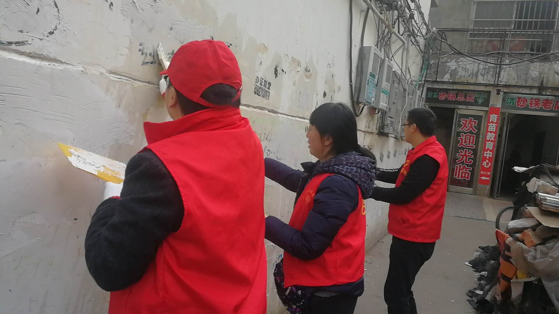 作為城市管理和市容環(huán)境整治的“主戰(zhàn)場”,川匯區(qū)自11月起設(shè)立“市容工作日”,進(jìn)一步深化“五城聯(lián)創(chuàng)”工作,切實(shí)改善中心城區(qū)面貌。11月27日,“市容工作日”活動正式啟動,川匯區(qū)各單位紛紛組織志愿者走上街頭,在各自轄區(qū)開展小廣告清理等環(huán)境綜合整治工作。圖一為志愿者粉刷布滿小廣告的建筑物外墻。圖二為志愿者清理地面上的小廣告。圖三為志愿者清理卷閘門上的小廣告。