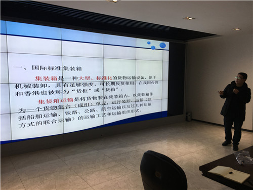 圍繞集裝箱的分類、結(jié)構(gòu)、制造材料、發(fā)展現(xiàn)狀和設(shè)備操作等業(yè)務(wù)知識,李宗潭博士展開話題,詳細闡述。在授課過程中,李宗潭博士通過多媒體的形式,圖文并茂,繪聲繪色,聽眾們?nèi)褙炞?,并不斷做筆錄。