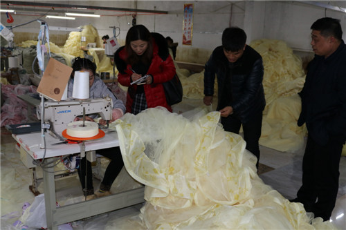 “對于有勞動能力的貧困戶及留守婦女,只要報名一律錄用,根據(jù)個人能力提供合適崗位,免費進行業(yè)務技能培訓,變‘輸血’變‘造血’;成為熟練工的貧困戶,月收入均可達到3000元以上?!苯饎P盛家紡“扶貧車間”位于吳小廟村邊,該公司負責人趙開軍是楊湖口鎮(zhèn)走出去打工、在事業(yè)有成后返鄉(xiāng)創(chuàng)業(yè)的一個普通80后,他的公司總部位于江蘇省南通市,像這樣的幾百人加工基地附近有二三家,加工的產品一般是通過天貓、京東等知名電商平臺在全國進行銷售,實行網(wǎng)上實行統(tǒng)一下單、就近發(fā)貨,這幾個基地主要負責長江以北市場銷售,公司去年年銷售額已突破5000萬元,解決周邊村莊數(shù)千人在門口就業(yè),帶動100多戶貧困戶脫貧。