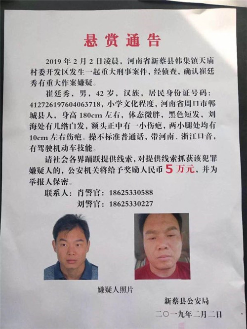 2月2日凌晨,駐馬店新蔡縣韓集鎮(zhèn)發(fā)生一起重大刑事案件,犯罪嫌疑人崔某因懷疑其妻子與受害人楊某有不正當(dāng)關(guān)系,午夜駕車沖進(jìn)受害人楊某的居住地放火將其殺害,犯罪嫌疑人崔某趁夜色潛逃。新蔡縣公安局黨委啟動(dòng)重大刑事案件偵破機(jī)制,緊急發(fā)布公安協(xié)查通報(bào),請求兄弟單位協(xié)助抓捕。并發(fā)布懸賞通告,懸賞5萬元通緝崔某。結(jié)合犯罪嫌疑人崔某可能逃跑路線,新蔡警方先后輾轉(zhuǎn)溫州、青島、臨泉、周口等地開展抓捕工作,均未果。