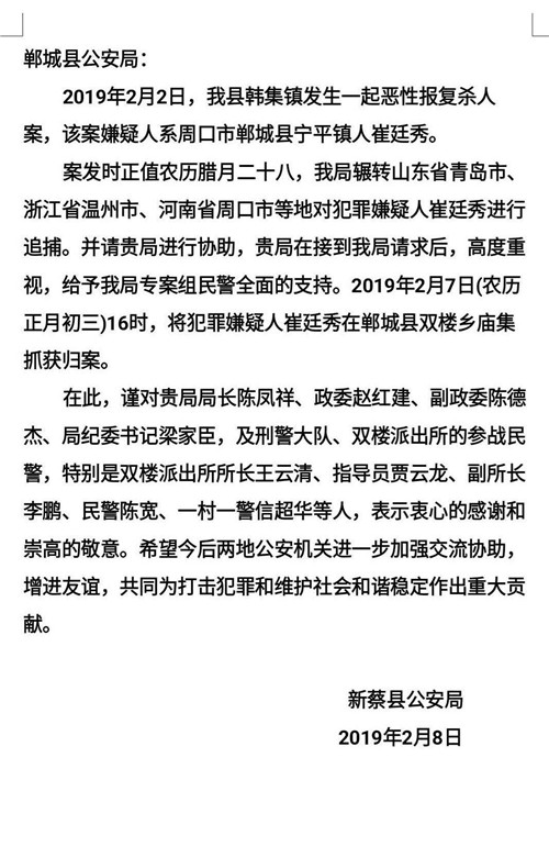 2月7日,在鄲城縣公安局局長陳鳳祥,政委趙紅建,黨委委員、紀(jì)委書記梁家臣的指揮下,鄲城縣公安局雙樓派出所經(jīng)過多日連續(xù)工作,成功將駐馬店新蔡縣“2019.2.2”重大刑事案件犯罪嫌疑人崔某抓獲。