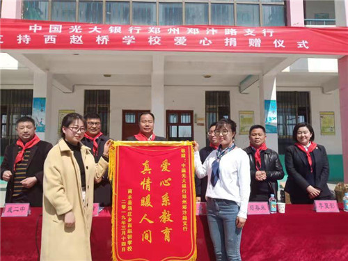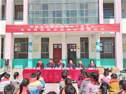 3月14日上午,陽光明媚,春意盎然。中國(guó)光大銀行鄭州鄭汴路支行向商水縣湯莊鄉(xiāng)趙橋?qū)W校愛心捐贈(zèng)儀式在趙橋?qū)W校內(nèi)舉行。河南省委組織部駐西趙橋村第一書記楊永,商水縣教體局負(fù)責(zé)人鄭春來、湯莊鄉(xiāng)黨委書記潘建甫等出席捐贈(zèng)儀式。