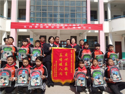 捐贈(zèng)儀式上,鄭汴路支行行長(zhǎng)苗長(zhǎng)海一行向趙橋?qū)W校捐贈(zèng)文具袋50只、書包50個(gè)、跳繩50根、板球拍50對(duì)、熱水袋50只、圍巾50只、跳棋50盒、沙包200個(gè)。苗長(zhǎng)海表示,光大銀行鄭州鄭汴路支行會(huì)一如既往的積極響應(yīng)黨中央脫貧攻堅(jiān)的重大部署,與省、市、縣、鄉(xiāng)結(jié)合繼續(xù)開展形式多樣的愛心扶貧等公益活動(dòng)。他希望趙橋?qū)W校要運(yùn)用好捐贈(zèng)的學(xué)習(xí)、生活、體育用品,同時(shí)勉勵(lì)孩子們一定要好好學(xué)習(xí)、將來回報(bào)社會(huì)各界的關(guān)愛和支持。