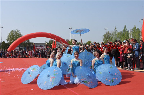 比賽進(jìn)行到將近一半時(shí)候,縣第二實(shí)驗(yàn)小學(xué)參賽隊(duì)帶來的舞蹈《麗人行韻》將大賽推向了高潮。表演開始,身著天藍(lán)漸變色長裙的38名姑娘手持彩傘一字列隊(duì)緩步入場,正當(dāng)觀眾們看得入神時(shí),她們突然將彩傘都齊刷刷地舉過頭頂并瞬間打開,無數(shù)粉紅色的花瓣從彩傘中紛紛飄落,像從碧藍(lán)的天空中下起了無盡的花瓣雨。選手們短短幾秒鐘的舉動,在廣場上勾勒出了一個(gè)人間仙境,引人入勝。在粉紅花瓣的映襯中,傘下腳步輕盈的女子們微微舞動,美若天仙,婀娜多姿,展現(xiàn)了“人面桃花相映紅,桃花依舊笑春風(fēng)”的作品主題。