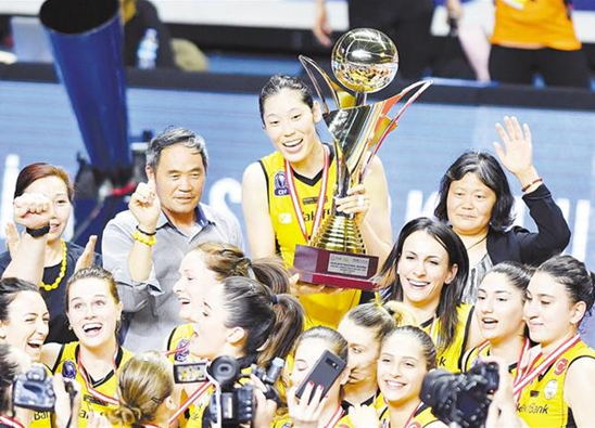 5月5日,瓦基弗銀行隊(duì)球員朱婷(中上)邀請(qǐng)父母進(jìn)入球場慶祝奪冠。 當(dāng)日,在2018-2019賽季土耳其女排超級(jí)聯(lián)賽決賽第五回合比賽中,瓦基弗銀行隊(duì)客場以3比0戰(zhàn)勝伊薩奇巴希隊(duì),以總比分3比2成功衛(wèi)冕聯(lián)賽冠軍。朱婷也蟬聯(lián)了聯(lián)賽MVP(最有價(jià)值球員)稱號(hào)。 新華社記者 徐速繪 攝