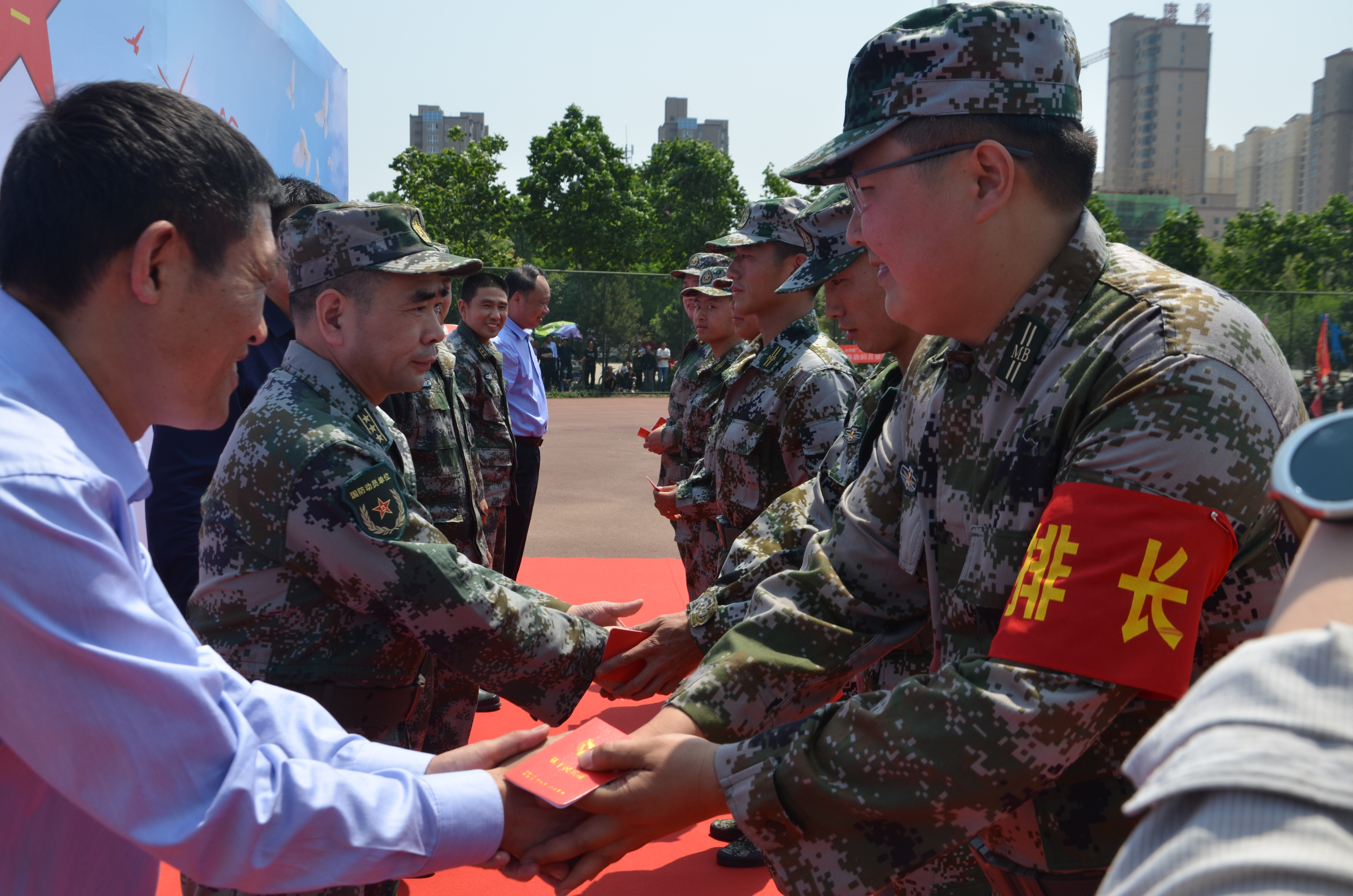 大會在雄壯的《解放軍軍歌》中拉開了序幕??h委常委、人武部政委曹新旺宣布基干民兵排以上干部任職命令,縣委常委、常務(wù)副縣長郝四春代表縣委、縣政府、縣人武部為基干民兵分隊(duì)授旗,綜合應(yīng)急連指導(dǎo)員、縣人武部政工科長李紅藝帶領(lǐng)全體民兵面對國旗宣讀民兵誓詞。在場領(lǐng)導(dǎo)向民兵代表發(fā)放了基干民兵證和入隊(duì)通知書,民兵代表和教練員代表分別進(jìn)行了表態(tài)發(fā)言。