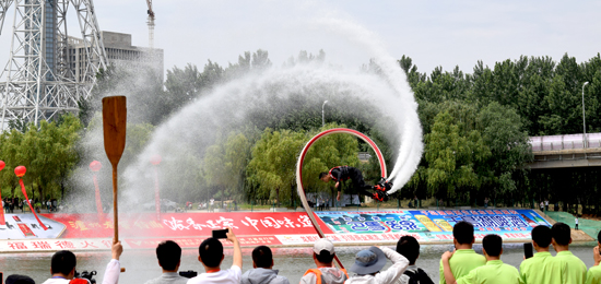 水上飛行器表演是觀賞性較高的水上表演之一,俗稱水上“鋼鐵俠”,是一項(xiàng)由外國人發(fā)明的水上摩托表演項(xiàng)目,兩人一組,一人駕駛摩托艇,一人在水面表演。飛行器的動力主要來自于摩托艇,靠一根水管連接在摩托艇的噴射口,通過摩托艇的噴射動力把人沖起來,最高能達(dá)到10米。表演者要在空中完成各種花樣動作,這對表演者的平衡及身體協(xié)調(diào)能力要求很高。