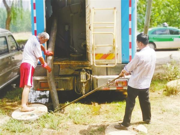 站在公廁旁的污水邊,該負(fù)責(zé)人指揮專門處理糞液的車輛到達(dá)現(xiàn)場,并就該公廁的情況向記者進(jìn)行說明?!斑@個公廁是由市園林處負(fù)責(zé)修建的,建好投入使用的時候就沒有鋪設(shè)污水管道,只配套了一個能容納9立方米污水的化糞池。因為附近有小廣場,健身的市民多,公廁使用的頻率高,一個化糞池不夠用,我們又增加了一個能夠容納10立方米污水的化糞池,定期進(jìn)行清理。”該負(fù)責(zé)人說。