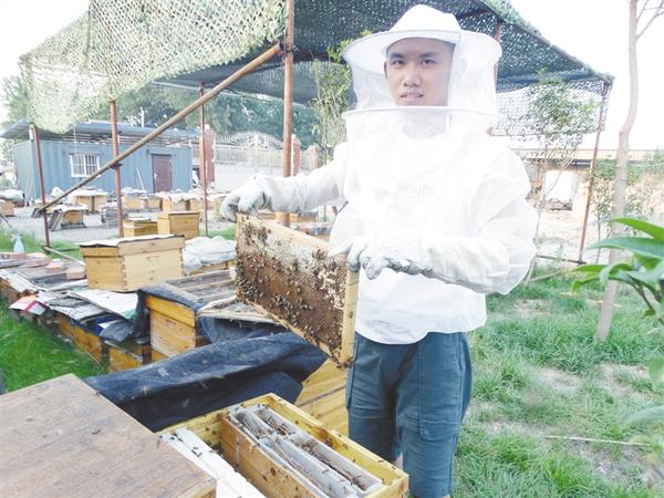 6月24日,沈丘縣付井鎮(zhèn)九里村的退伍軍人蘇尚方,正小心翼翼地從蜂箱里取出蜂蜜板,準備采收蜂蜜?!拔茵B(yǎng)了120多箱蜜蜂,年產(chǎn)蜂蜜3000多公斤,經(jīng)濟收入十分可觀?!碧K尚方說,他專門成立了蘇家養(yǎng)蜂專業(yè)合作社,帶領(lǐng)當(dāng)?shù)刎毨粢黄鹈撠氈赂?。謝辛凌 攝