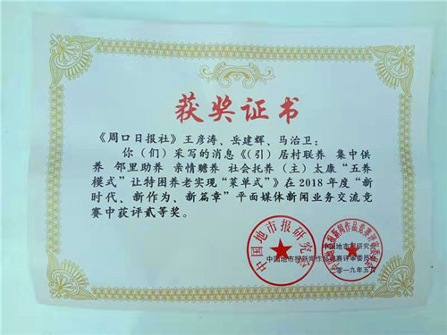 中國地市報新聞獎評選活動由中國地市報研究會主辦,每年舉辦一次,在全國有著廣泛的影響,此項(xiàng)新聞獎評選活動涉及全國幾乎所有地市黨報,不僅是展示地市黨報形象的重要舞臺,也是衡量地市黨報辦報水平的重要標(biāo)志,同時也是以新聞的形式展示各地亮點(diǎn)工作的重要?!短怠拔屦B(yǎng)模式”讓特困養(yǎng)老實(shí)現(xiàn)“菜單式”》稿件在此項(xiàng)新聞獎評選中,同樣表現(xiàn)不凡,最終榮獲中國地市報新聞獎二等獎。