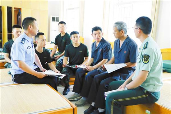 7月26日上午,太康縣人民法院的法官們來到縣武警中隊,為武警官兵提供法律咨詢和服務活動,解決他們在日常工作、生活中遇到的法律問題,并向他們贈送《軍人維權(quán)指南》《法律小常識》等有關法律書籍及慰問品,受到了熱烈歡迎。圖為該院法官向武警官兵講解法律常識。