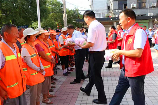 8月8日,扶溝縣政協(xié)主席張建中帶領(lǐng)縣政協(xié)委員和政協(xié)機(jī)關(guān)志愿者到縣城桐丘路視察文明城市創(chuàng)建工作,并看望慰問環(huán)衛(wèi)工人和城管工作人員??h政協(xié)常委田孟偉代表達(dá)理家居有限公司捐贈(zèng)價(jià)值2萬(wàn)余元防暑降溫用品,助力扶溝縣省級(jí)文明城市創(chuàng)建工作。