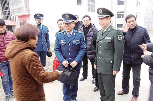項城市人武部部長矯百成一行敲鑼打鼓為立功受獎官兵家庭送喜報