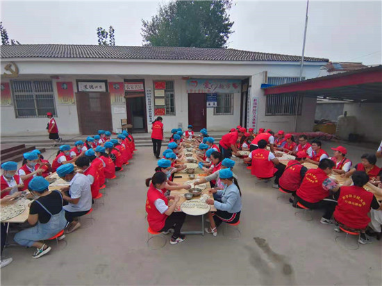 與此同時,在演出現(xiàn)場附近的村委大院內(nèi),由周口市慈孝文化促進會、北斗達教育集團等組成的200多名志愿團隊正忙得不亦樂乎,調(diào)餡、包餃子、下鍋、端盤,兩個多小時內(nèi),他們精心包出20000多個愛心水餃。11時30分,餃子宴正式開始,老人們一邊吃著水餃一邊觀看者演出,喜笑顏開,呈現(xiàn)出一片相親相敬的溫馨畫面。